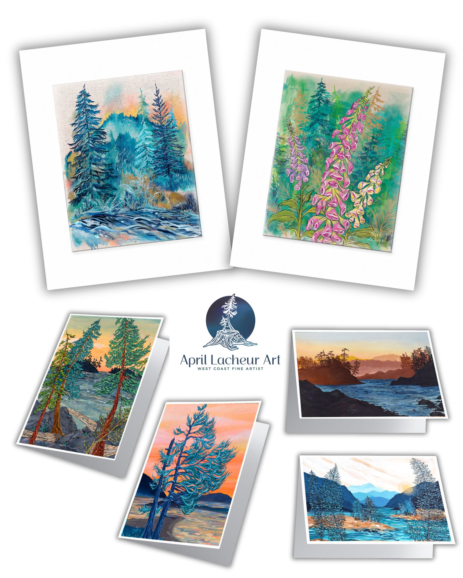 April Lacheur’s West Coast inspired paintings are created in a unique style that includes her signature line work and focus on the beauty and wonder of trees. April offers original acrylic paintings as well as reproductions such as art cards, prints, calendars, art bags, art pillows and notebooks. Perfect for the nature and art lover on your list!